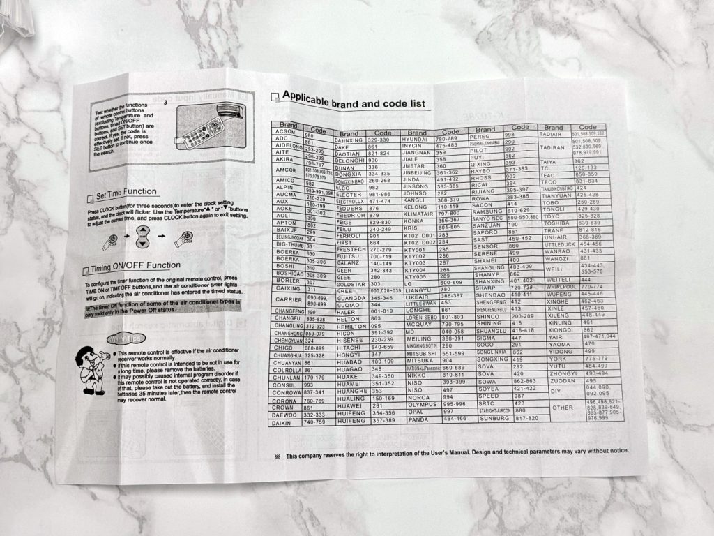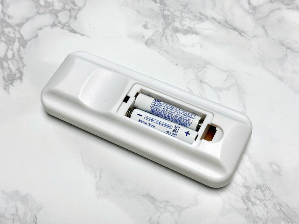 구입한 리모컨은 AAA 전지 두 개를 넣으면 전원이 들어 옵니다. 다음 할일은 에어컨 본체와 리모컨의 코드를 맞출 필요가 있는데 에어컨 제품마다 방법이 다르니 세팅 방법을 확인해야 합니다.