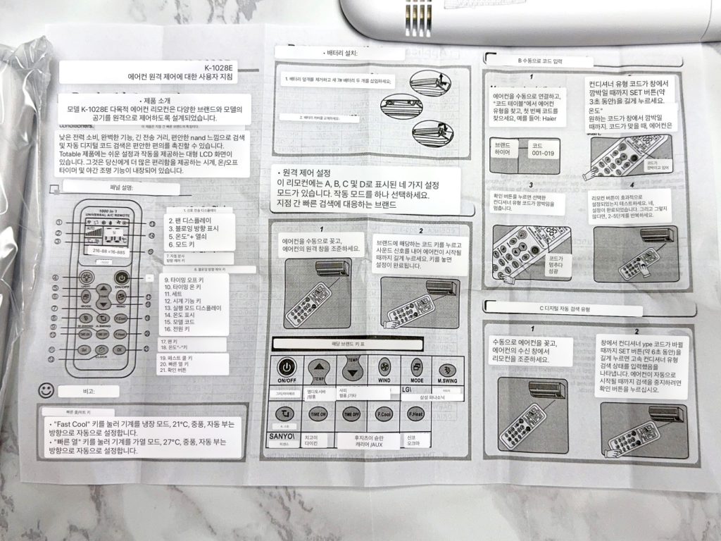 그래서 알리익스프레스에서 ‘에어컨 만능 리모컨’으로 검색을 시작했고 곧바로 적당해 보이는 리모컨을 찾았습니다. 제품명은 ‘범용 에어컨용 리모컨 K 1028E’이고 가격은 1달러가 조금 넘는 금액이었습니다. 아마도 ‘에어컨 리모컨’으로 검색하면 쉽게 찾을 수 있을 겁니다.
