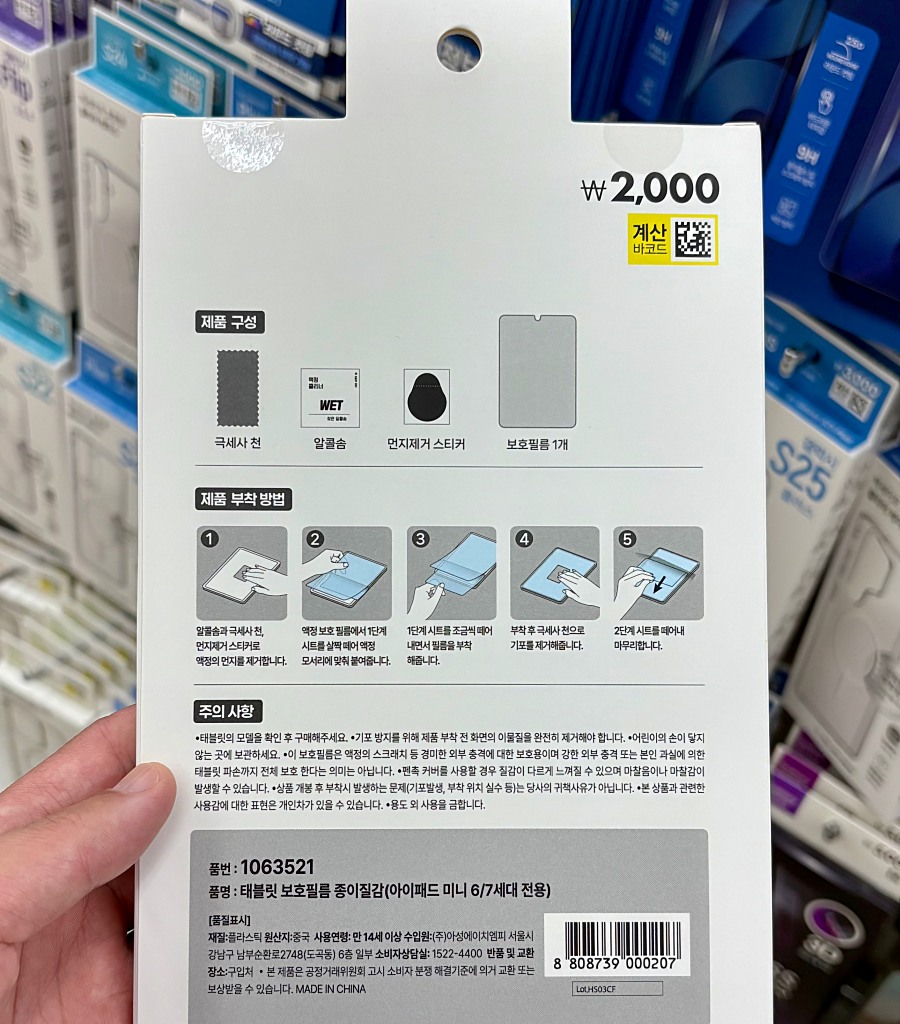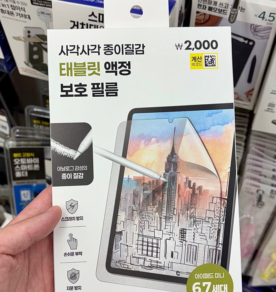 정확한 상품 명칭은 ‘사각사각 종이 질감 태블릿 액정 보호 필름’이고 가격은 2천 원입니다. 한 장의 필름이 들어 있어요