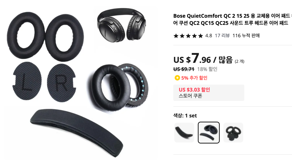 Bose QC35 헤드폰 이외에도 웬만한 이어쿠션 부품을 알리에서 구입할 수 있습니다. 원래 구입했던 검정색 뿐아니라 여러가지 색이 있으니 새 느낌을 원하시면 다른 색으로 바꿔보시는 것도 좋을 것 같습니다.