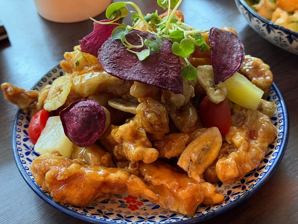 요즘 유행하는 찹쌀 탕수육과는 결이 다릅니다. 두툼한 등심의 질감이 그대로 느껴지는, 잘 만든 돈가스처럼 든든한 스타일이죠. 은은한 계피 향이 돌면서 겉은 바삭하고 속은 쫄깃한데, 함께 튀겨 나오는 자색 고구마가 시각적인 즐거움까지 더해줍니다.