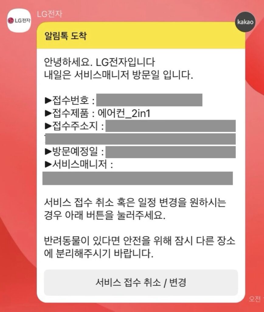 [LG전자 방문수리요청은 카카오톡을 통해 방문예정일과 담당자를 안내해줍니다]