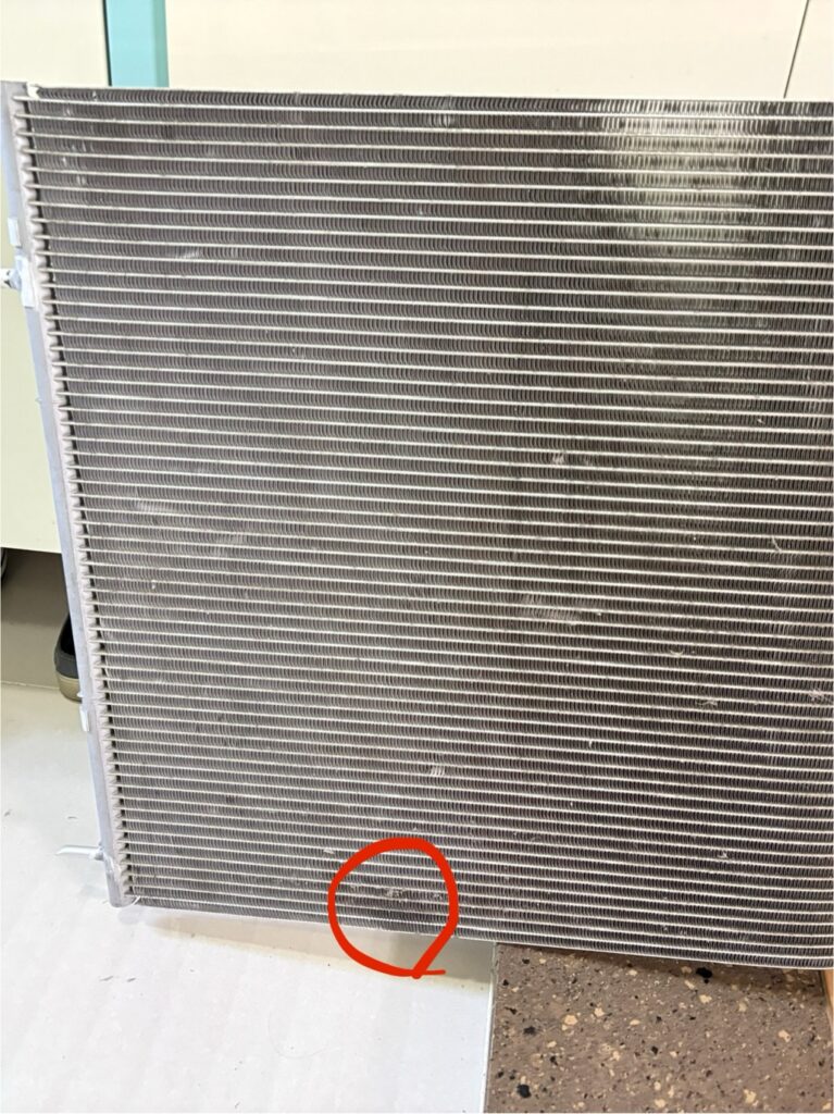[ 실외기에서 떄어낸 에어컨 응축기 부품, 빨간 원 부분에 검정 기름때가 보입니다[