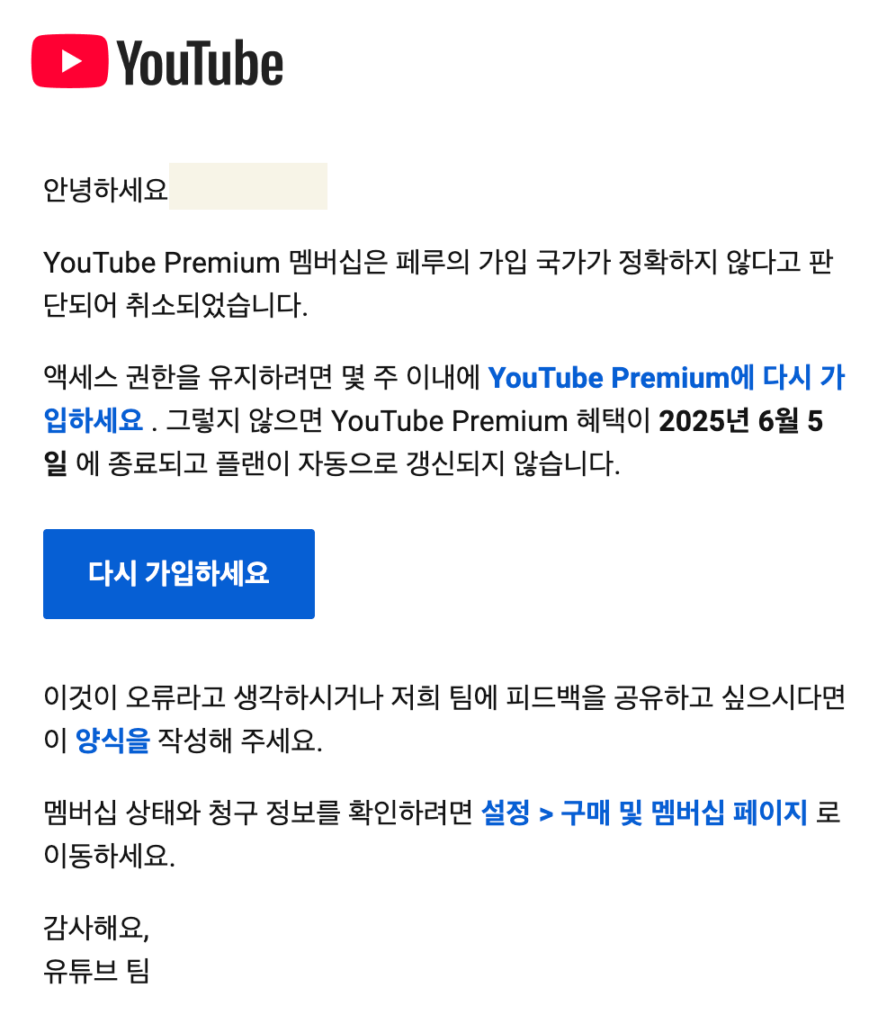 그렇게 몇 개월 동안 페루인으로 잘 살고 있다고 생각했는데, 2025년 5월 초, Gmail로 “가입하신 멤버십은 페루의 가입 국가가 정확하지 않다고 판단”된다며 한 달 정도 시간을 줄 테니 다시 떠나라는 메일을 받았습니다. 커뮤니티에서는 구글이 AI를 이용해 찾아내니 더는 갈 곳이 없을 것이라고 입을 모았고, 유튜브 패밀리 멤버십이 필요하다면 ‘일본’처럼 비싸지만 확실한 곳을 선택하는 것이 좋다고 조언했습니다.