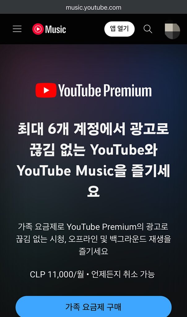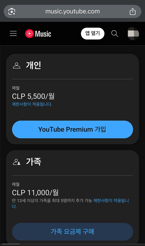 유튜브 뮤직 홈 → 메뉴 → 멤버십 → 멤버십 관리로 이동하면 칠레 유튜브 프리미엄 가입 화면이 ‘한글’로 표시됩니다. 개인 요금은 5,500 CLP(칠레 페소, 한화 약 8천 원)이고, 패밀리 요금은 11,000 CLP(칠레 페소, 한화 약 1만 6천 원)입니다.