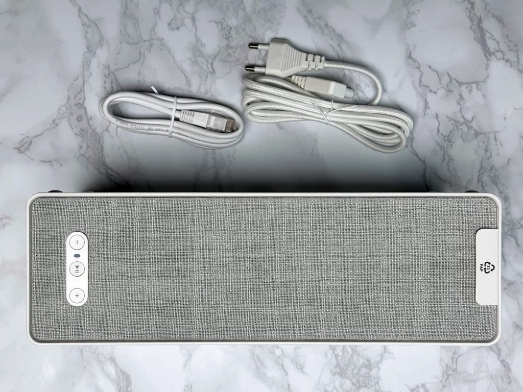 포장을 열면 스피커 본체, 전원코드, 랜선이 전부 입니다. 네트워크 스피커의 특성상 Aux같은 외부 연결선이 필요 없어 구성이 단순합니다. 전원선은 패브릭으로 고급스럽고 아답터가 내장되어 있어 바로 220v로 연결할 수 있습니다. (별도로 3m 전원 연장장선을 5천원에 판매 중입니다.)
