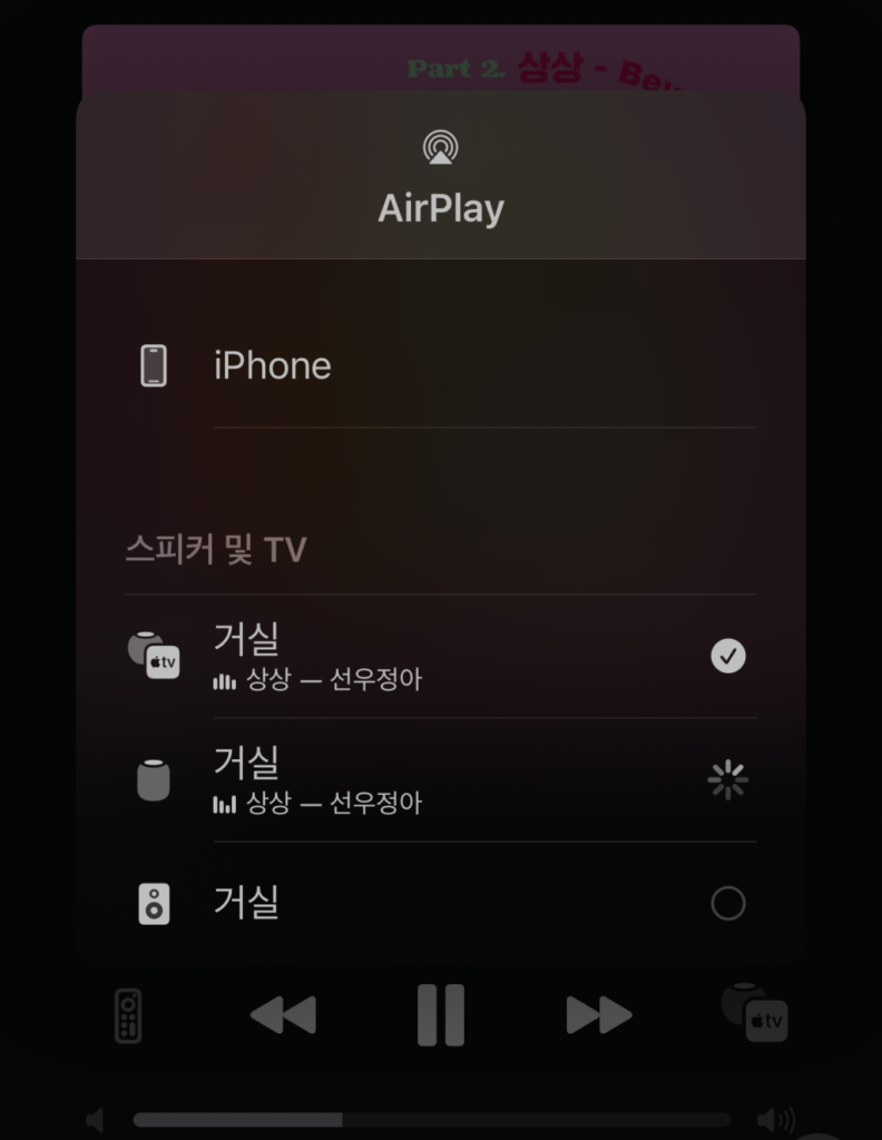 이미 사용 중인 홈팟2에 쉼포니스크를 추가로 연결했습니다. 이렇게 하면 애플TV의 기본 스피커는 홈팟2로 설정되고 또 다른 스피커로 쉼포니스크가 표시되어 각각의 스피커의 볼륨을 조절하여 들을 수 있습니다.