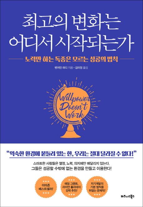 이책의 핵심을 요약하면 [성공을 위해 변화 하려면 ‘의지’로는 부족하고 ‘환경’이 중요하다]라고 할 수 있습니다. 이 책의 원제인 ‘Willpower Doesn’t Work : Discover the Hidden Keys to Success'(의지력만으로는 안된다: 성공을 위해 숨겨진 열쇠를 찾아라.)처럼 환경의 중요성을 책 곳곳에서 강조합니다.