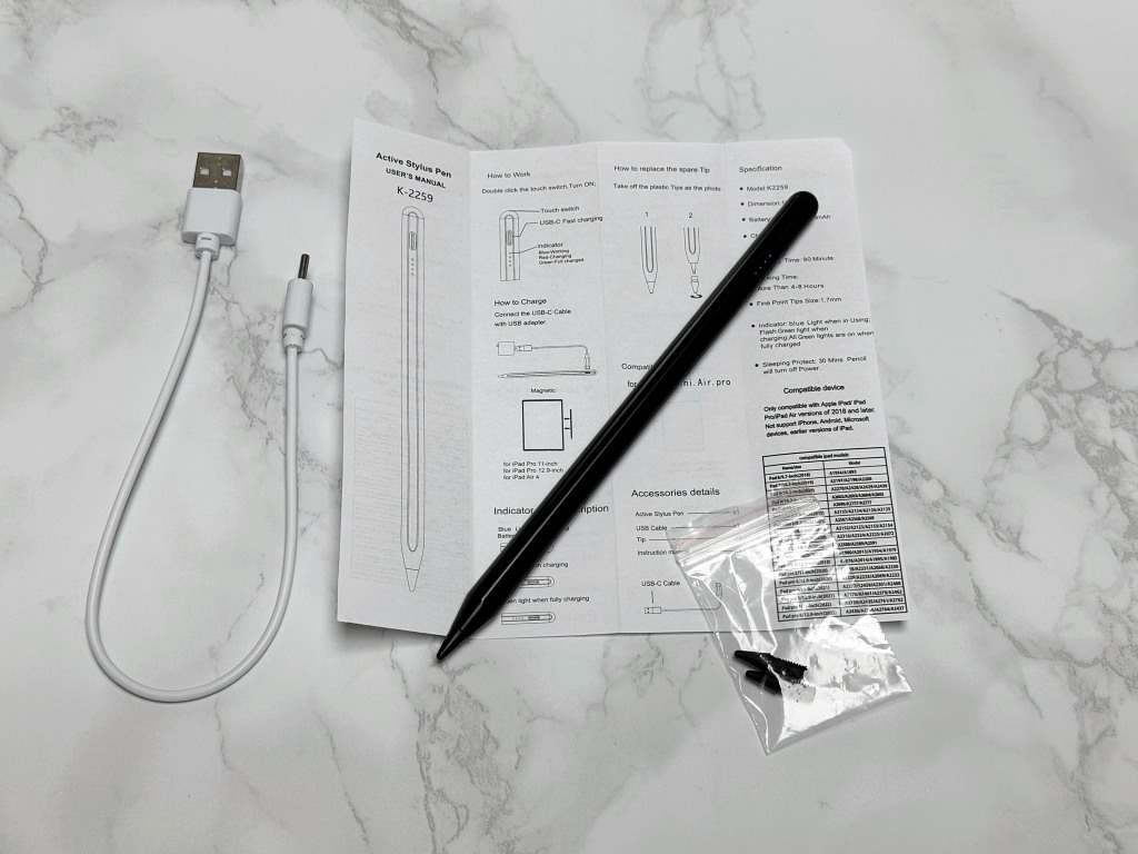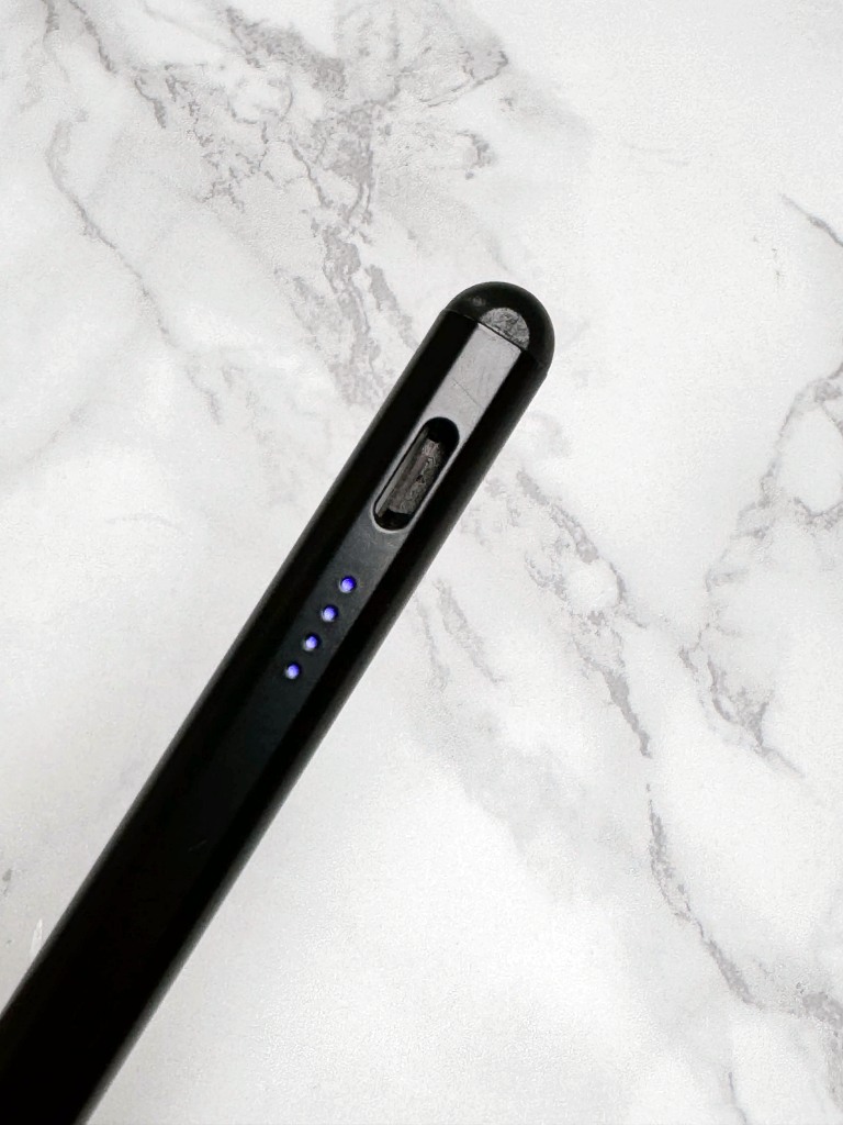 박스는 원가를 최대한 낮춘 듯 작은 상자에 본체와 케이블, 펜촉을 압축하여 포장해 두었습니다. 펜슬 본체는 애플펜슬과 동일하지만 유광이라 조금 저렴해 보입니다. 옆면에는 USB-C 충전 단자가 있고 바로 아래에는 현재 배터리 상태를 직관적으로 보여줍니다. 그리고 보니 몇 년 전에 구입한 구조독 6세대(?)와 거의 같은 모습이네요.
