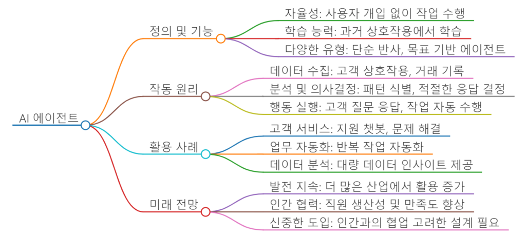 - 업무 자동화: 기업에서는 AI 에이전트를 사용하여 반복적인 작업을 자동화하고, 직원들이 더 복잡한 업무에 집중할 수 있도록 지원합니다[6][8].